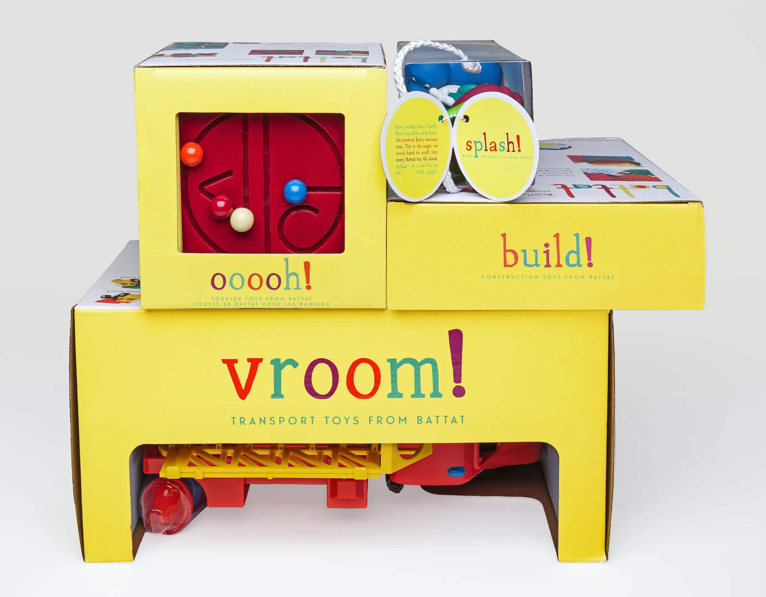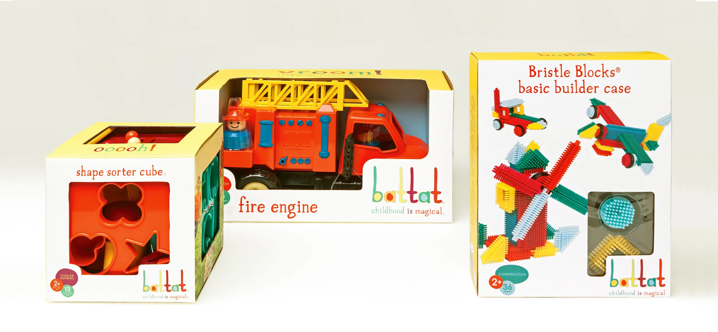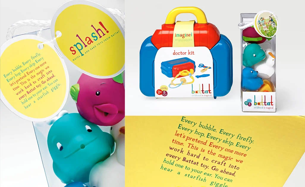 A total rebranding of Battat's toy line focused on the magic of childhood through, color palette, logo, tagline, toy names, and an energetic method of sorting toys into whimsical categories. We were also charged with unifying the brand to the product through recoloring the toys.